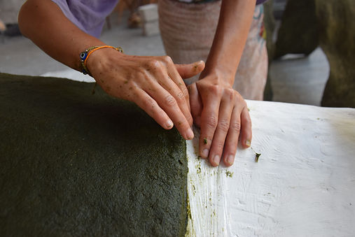 A l’instar des termites qui construisent leur habitat avec les matériaux qui se trouvent sur le territoire, l’installation est composée d’herbe, récoltée non loin du 18ème arrondissement et transformée via différentes étapes. L’herbe est séchée puis bouillie et broyée. La pulpe obtenue est ensuite mélangée à une colle végétale et moulée. Cette pâte d'herbe doit ensuite sécher plusieurs heures/jours pour arriver à la forme finale.